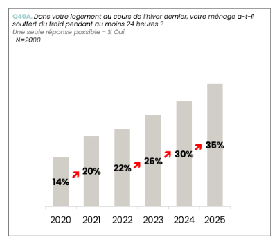Plus d’un tiers des personnes interrogées désormais (35%), selon l’enquête du Médiateur de l’énergie déclare avoir souffert du froid au cours de l’hiver précédent. La progression est constante depuis 2020 (14%). Et 49% déclarent avoir souffert d’un excès de chaleur au cours de l’été.