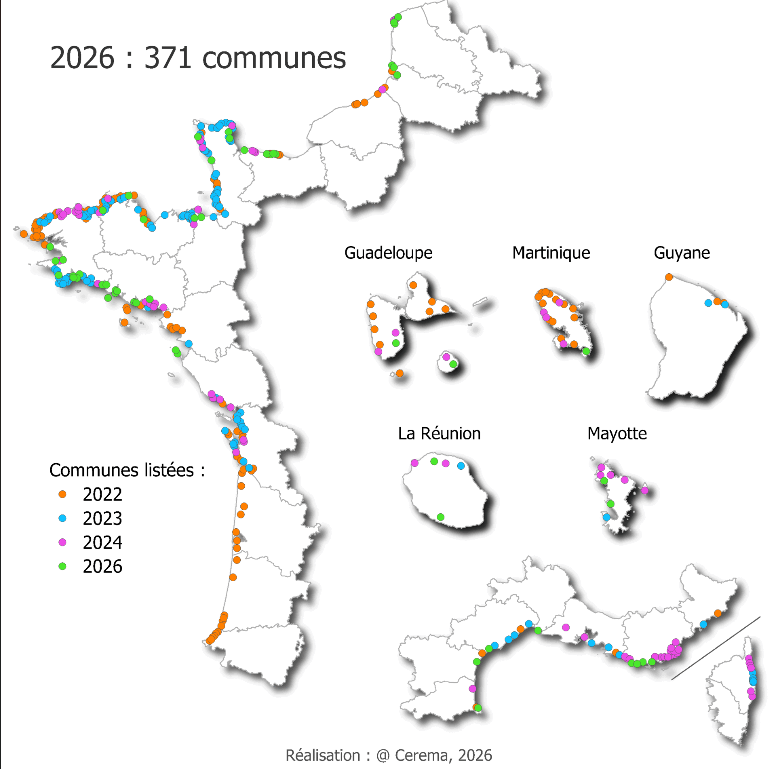 La liste des communes concernées s’allonge. Au total, 371 communes de France métropolitaine ou d’Outre-mer se dotent d’outils pour adapter leur territoire au recul du trait de côte.